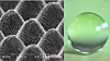 Til venstre detaljbilde av metallets overflate. Til høyre ser vi at vanndråper forblir runde på overflaten. Foto: Universitá degli studi di Parma.