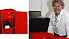 Stig Frode Berge fra Røros Produkter viser fram deres nye brann­sikre skap, der du kan opp­bevare nett­brett og mobil mens de lades.