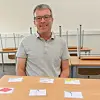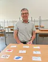 Roger Drange med et utvalg flash cards, som brukes i presisjonslæring for å automatisere kunnskap.