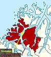 Det er renholdet på fastlandet som skal overtas av ISS. På figuren ses dette til høyre for Tromsøya. Tromsøs areal er markert i rødt og gult. (Kart etter Wikipedia).